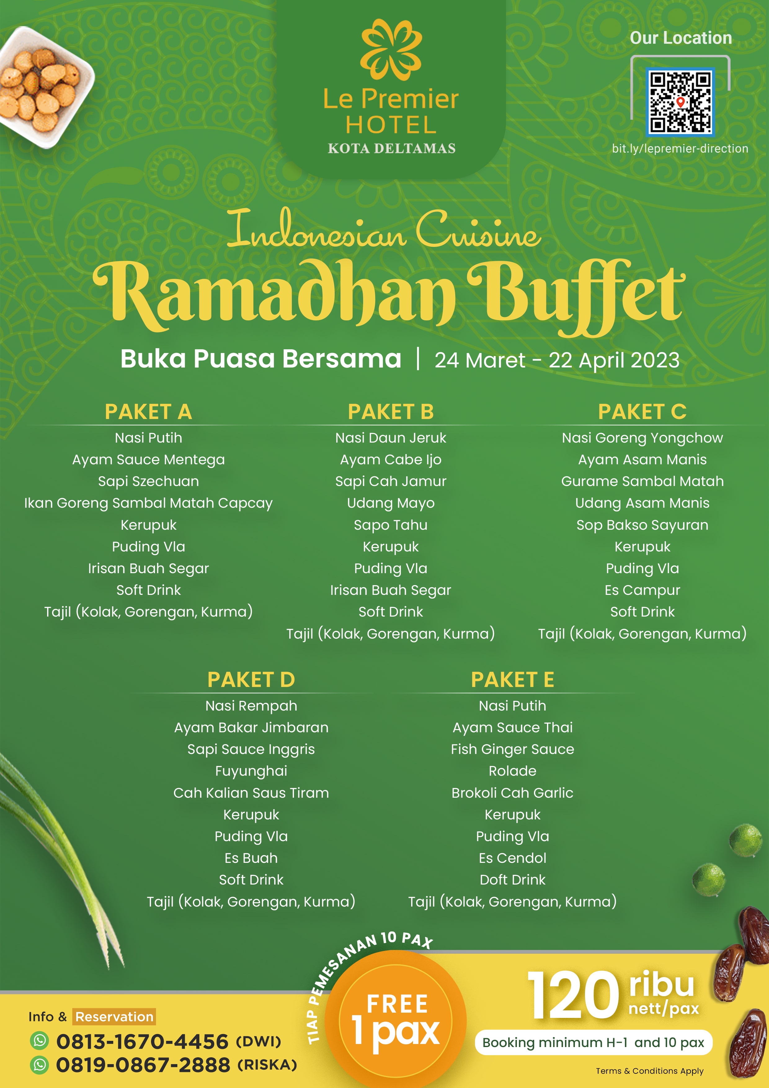 Harga paket buka puasa untuk per orang adalah Rp 120.000. Anda juga bisa mengajak 10 orang teman atau keluarga untuk buka puasa bersama, karena Le Premier Hotel Kota Deltamas memberikan promo Beli 10 Gratis 1 (berlaku kelipatan).