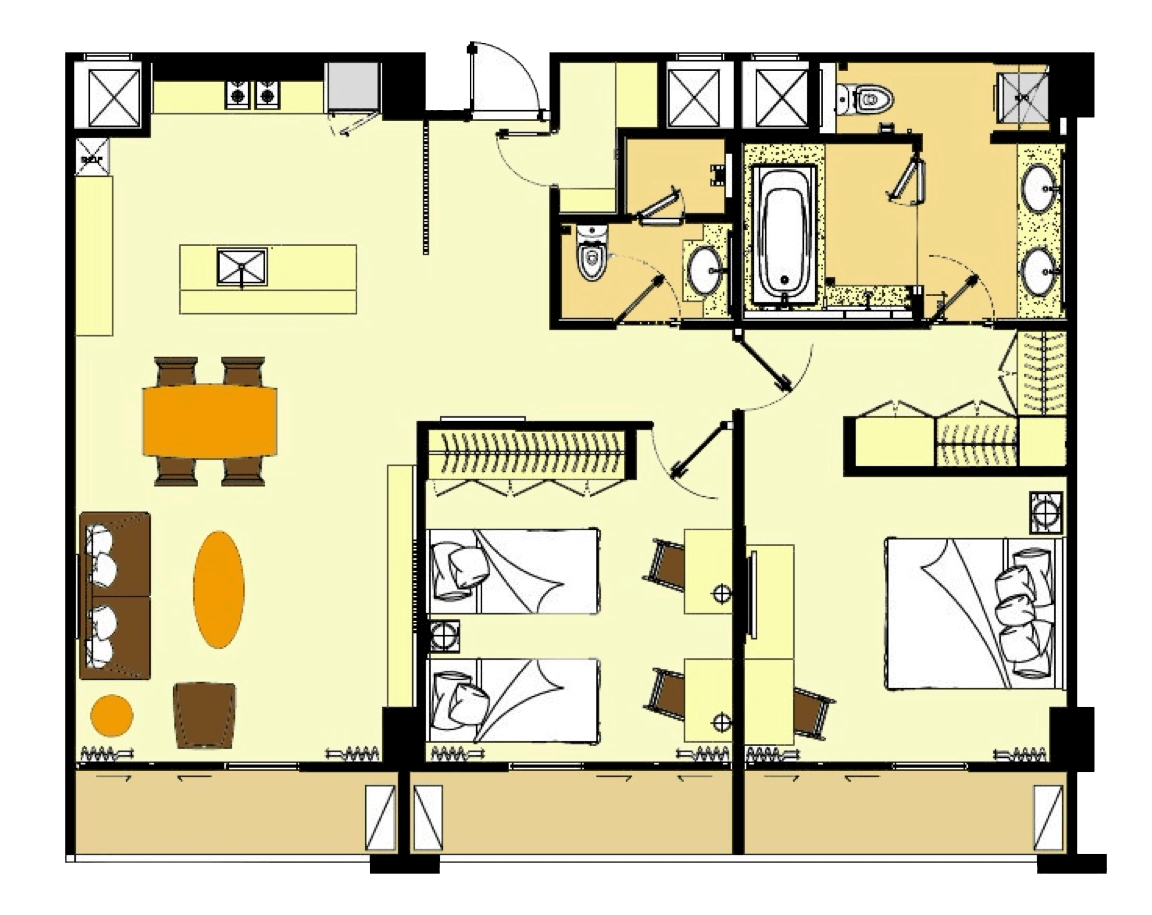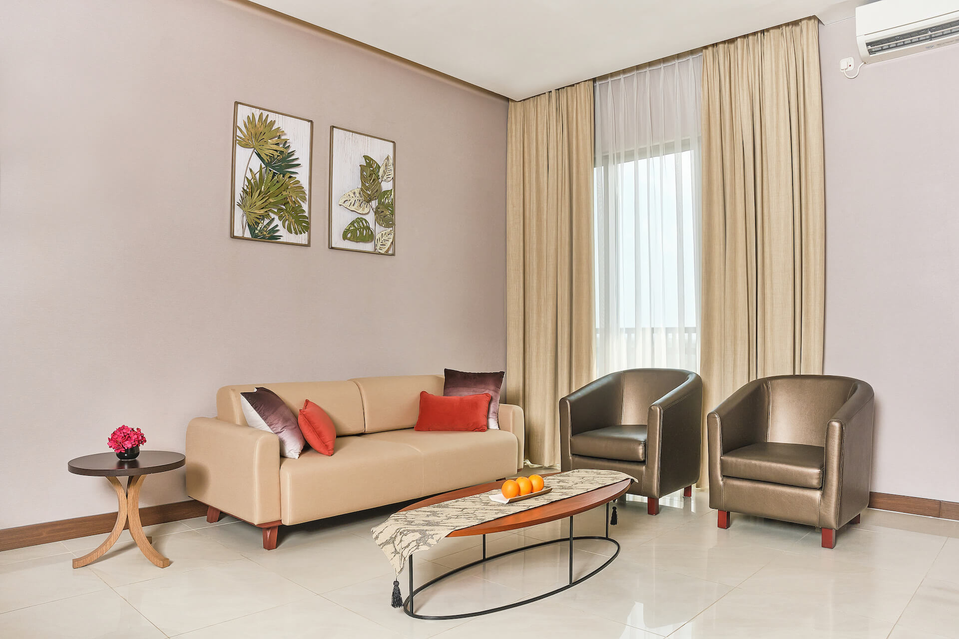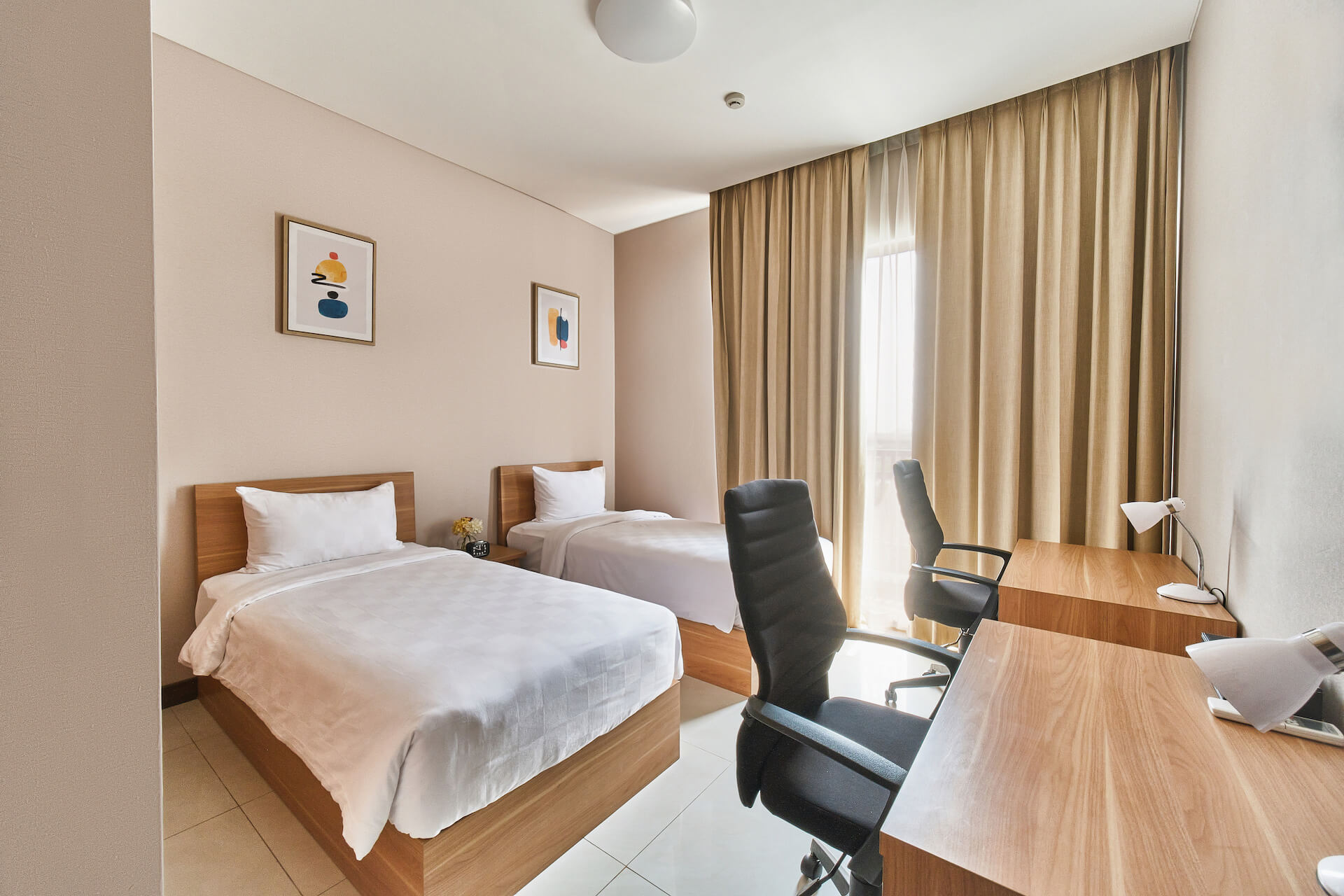 Measuring 100sqm, Premier Room features stunning room facilities. Optimized with separate main bedroom from children bedroom and a spacious living room with TV Program channel international channels, choose to rejuvenate with a relaxing nap in the recharging queen-sized bed in main bed room or eep updated with the current news over a cup of coffee & tea in the living room. This Premier Room also offers an elegant bathroom with separate rain shower and deep soaking tub with classic bath amenities. Whether you are traveling for business or leisure and stay with family, the room is well appointed for a comfortable.